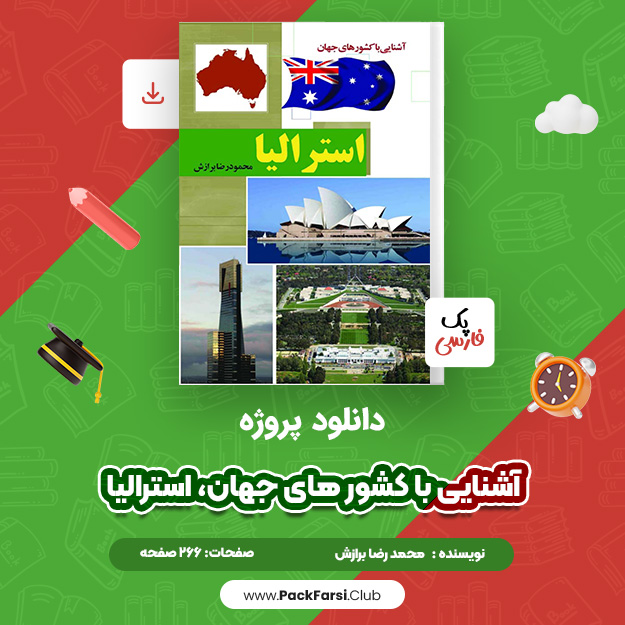 سایت پک فارسی دانلود PDF پروژه آشنایی با کشور های جهان، استرالیا اثر محمودرضا برازش ۲۶۶ صفحه پی دی اف را برای شما دوستان فراهم کرده است. این پروژه به معرفی کشور استرالیا می پردازد و جنبه های مختلف این کشور را از نظر جغرافیا، فرهنگ، تاریخ، اقتصاد و زندگی اجتماعی بررسی می کند. استرالیا به عنوان ششمین کشور بزرگ جهان، دارای تنوع طبیعی و فرهنگی قابل توجهی است. این پروژه به بررسی ویژگی های طبیعی مانند صحرای بزرگ، جنگل های بارانی و حیات وحش منحصر به فرد پرداخته و همچنین به تاریخچه ی این کشور از زمان بومیان اولیه تا استعمار انگلیسی ها و تحولات مدرن می پردازد. هدف پروژه آشنایی بیشتر با فرهنگ، اقتصاد و جنبه های زندگی روزمره در استرالیا است. با سایت پک فارسی همراه باشید.