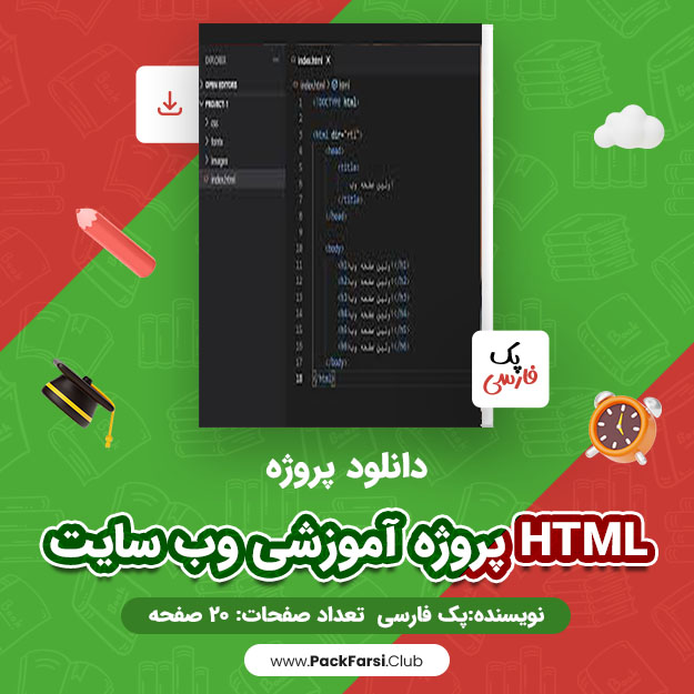 سایت پک فارسی. دانلود PDF پروژه آموزشی وب سایت HTML اثر پک فارسی ۲۰ صفحه پی دی اف را برای شما دوستان فراهم کرده است. HTML مخفف HyperText Markup Language است و به عنوان زبان اصلی برای ساخت صفحات وب استفاده میشود. HTML به مرورگر میگوید که چگونه محتوای یک صفحه را نمایش دهد. بهترین راه برای یادگیری HTML، تمرین مداوم است. سعی کنید صفحات سادهای را خودتان طراحی کنید. با سایت پک فارسی همراه باشید.