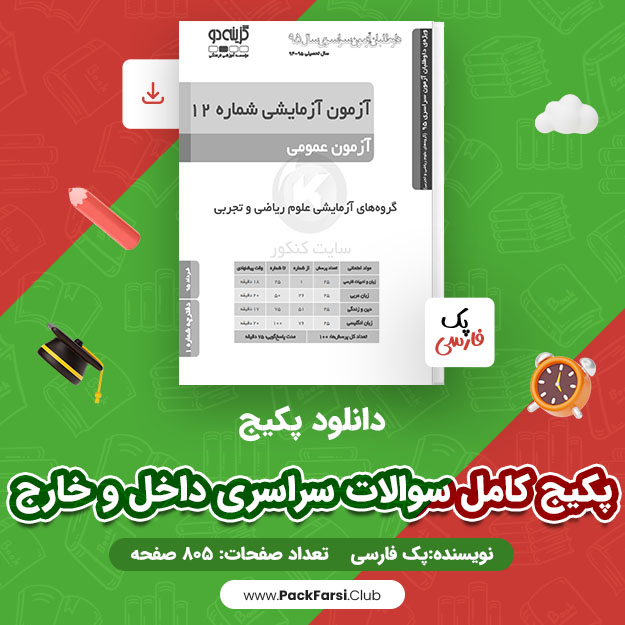 سایت پک فارسی. دانلود PDF پکیج کامل سوالات سراسری داخل و خارج اثر پک فارسی ۸۰۵ صفحه پی دی اف را برای شما دوستان فراهم کرده است. پکیج کامل سوالات سراسری داخل و خارج یکی از مهمترین ابزارها برای آمادگی در کنکور است. این پکیجها شامل مجموعهای از سوالات منتخب و طبقهبندی شده از آزمونهای سراسری سالهای گذشته، داخل و خارج از کشور هستند که به شما کمک میکنند تا با سبک سوالات کنکور آشنا شوید، نقاط ضعف خود را شناسایی کنید و در نهایت به موفقیت در کنکور دست پیدا کنید. با سایت پک فارسی همراه باشید.