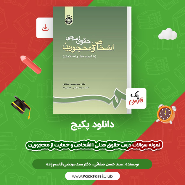 سایت پک فارسی دانلود PDF پکیج نمونە سوالات درس حقوق مدنی ۱ اشخاص و حمایت از محجورین ۲۲ صفحه پی دی اف را برای شما دوستان فراهم کرده است. پکیج “نمونه سوالات درس حقوق مدنی ۱: اشخاص و حمایت از محجورین” یکی از منابع جامع و کاربردی برای دانشجویان رشته حقوق است. این پکیج به منظور کمک به آمادگی دانشجویان در آزمون های مرتبط با درس حقوق مدنی ۱ طراحی شده و شامل مجموعه ای از سوالات استاندارد و متنوع است که در سال های گذشته مطرح شده اند. درس حقوق مدنی ۱ به بررسی اشخاص حقوقی و حقیقی و همچنین حمایت قانونی از محجورین (افرادی که از نظر قانونی توانایی انجام برخی امور را ندارند، مانند کودکان، افراد مبتلا به بیماری های روانی و …) می پردازد. محتوای این درس شامل مباحثی چون تعریف اشخاص در حقوق، انواع محجوریت و قوانین حمایتی برای محجورین است. دانشجویان در این درس با مفاهیمی مانند حقوق و وظایف اشخاص حقیقی و حقوقی، اهلیت حقوقی، و قوانین حمایتی برای افراد محجور آشنا می شوند. با سایت پک فارسی همراه باشید.
